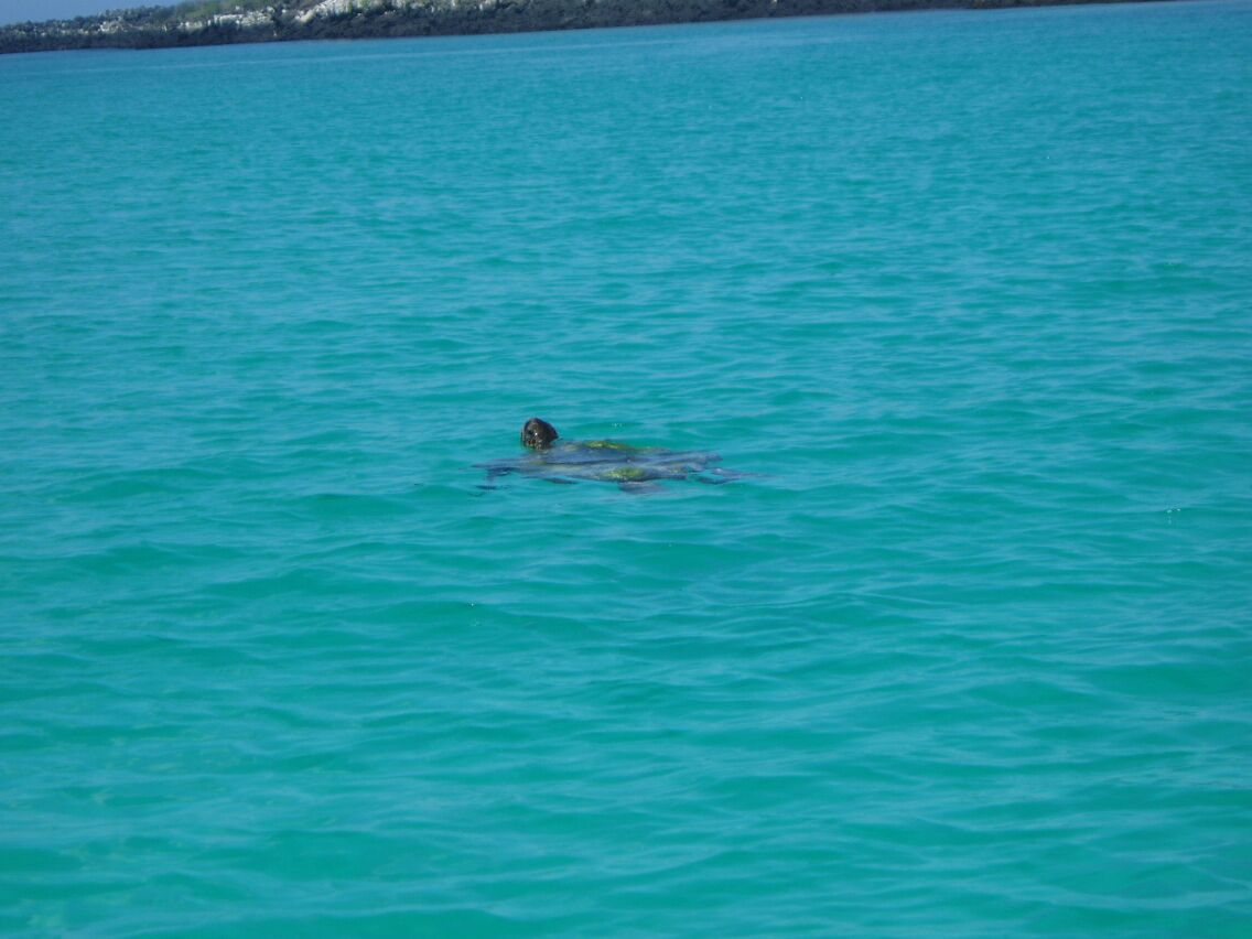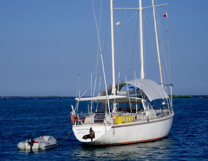 We sailed into "Wreck Bay," Cristobal, Galapagos on Saturday morning. The sea was like glass with almost no wind. There was a haze on the horizon and no lights showing from the Island we were approaching, until we were 8 miles or so from the harbor. As we came into the harbor, we saw pairs of fins sticking out of the water. It was just dawning and not obvious at first what we were seeing. Then it came to us. We were seeing sea lions floating just below the surface on their "backs." Sleeping at sea?