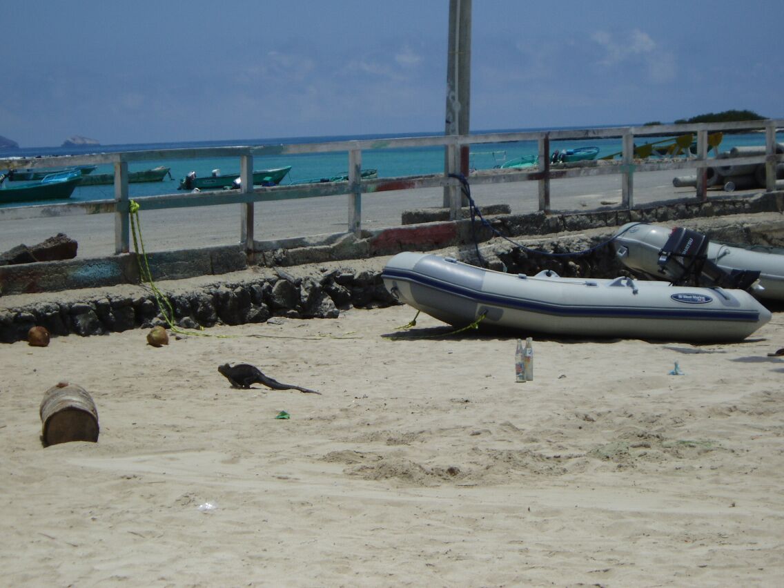 Once we had dropped anchor, cleaned up, inflated the dinghy, cleaned up again from the effort of inflating, and launching the dinghy etc., we set off to visit the Port Captain's office and begin the entry procedure. Each boat or dinghy that we passed was festooned with sleeping sea lions. Some boats had 6 or more sea lions on the front of the boat, so that the back of the boat was lifted completely out of the water. We ran our dinghy up a beach next to the port captain's office and had to walk between more groups of sea lions. They are everywhere. In the children's swimming area. Along the sidewalks. On the benches.