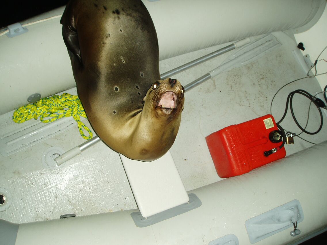 We ate out in town and came back to the boat rather later than we had intended, so we just tied the dinghy off the stern of the boat. At 2 a.m. Annette woke me to say that the dinghy was full of seals. Well, there were two of them and they looked at us with polite interest