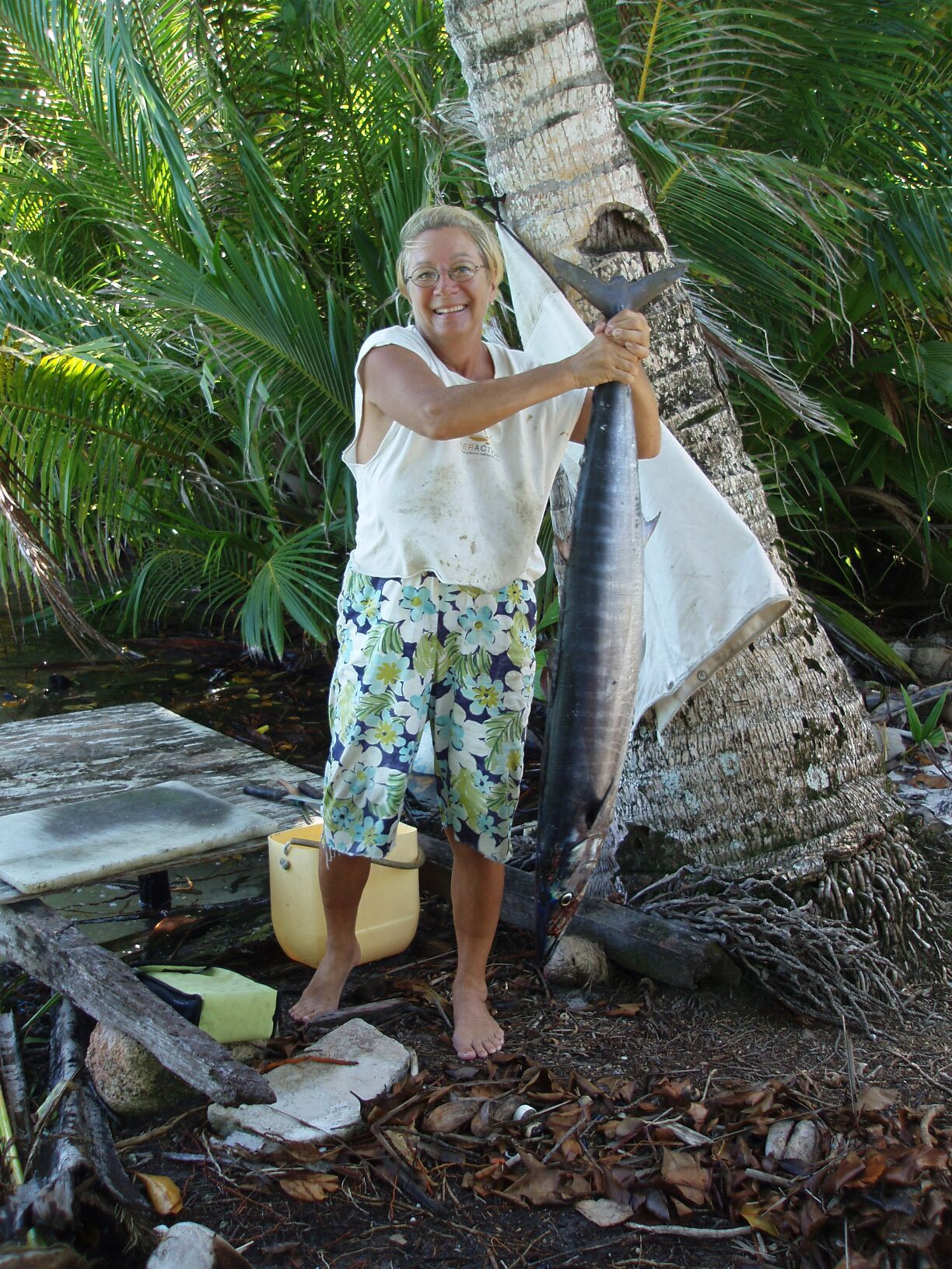 day outside the reef at high tide. We watched as they filleted a five foot Wahoo and then threw the carcass off the Baddam pier. Within seconds there were a dozen or more reef sharks fighting over