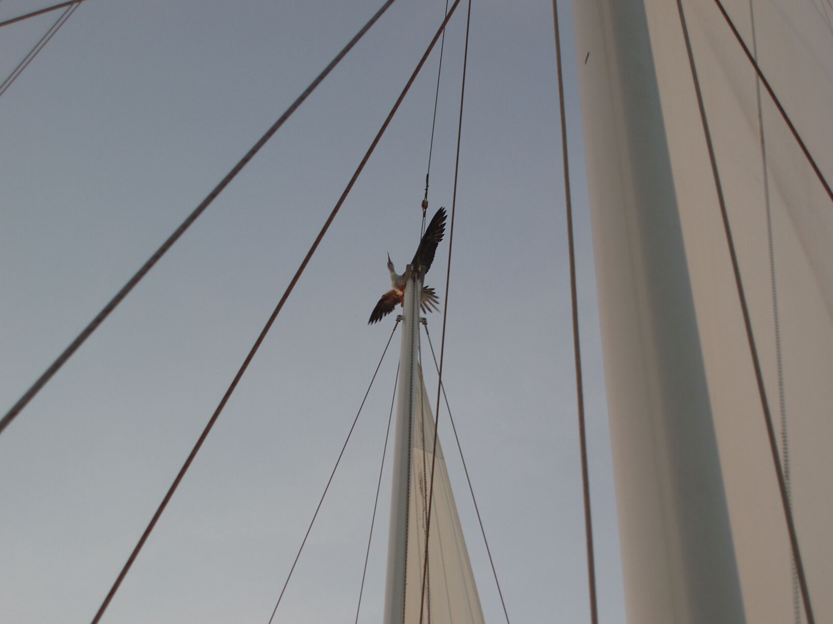 good news was that our birdy friend had not returned to his perch of the previous night. The bad news was that he had now selected the top of the mizzen mast. We yelled, we used bright