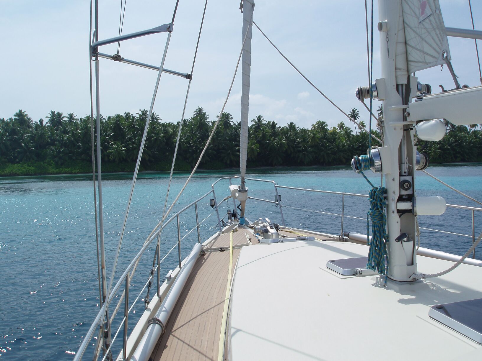 We sailed through the lagoon pass at 0900 hours and carefully transited the lagoon, with Annette standing some 10 foot off the deck on the main shrouds, scanning ahead for obstacles.