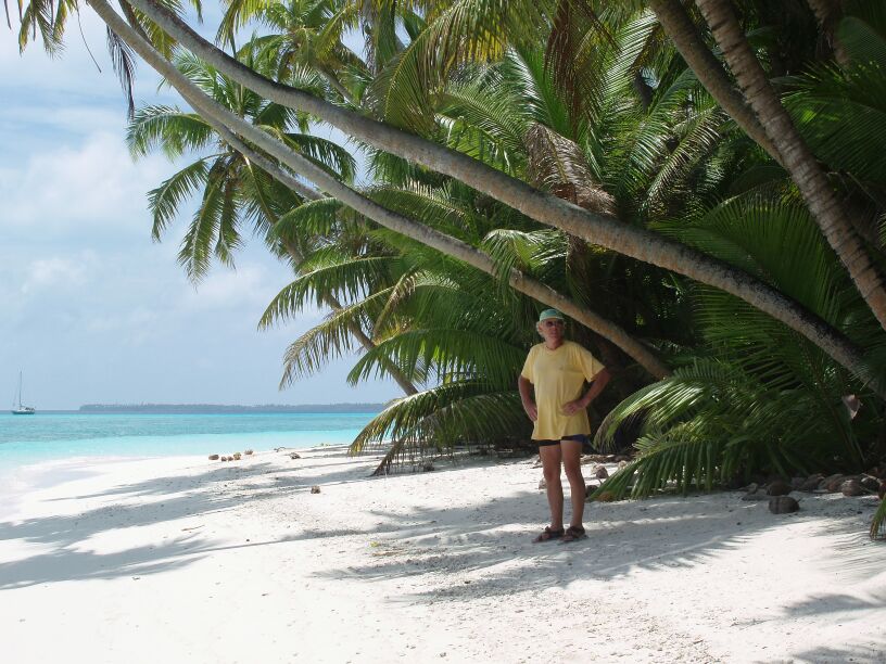 Robinson Crusoe (or perhaps Girl Friday?). We have thoroughly explored the islands and photographed all of the ruins and all of the coconut crabs. We have watched as a "heart of palm" was extracted and then eaten it in salad. The snorkeling has been excellent and on the shallow reef we have spotted a beautiful and venomous "lion fish" as well as a huge octopus. The later was amazing to watch as it changed color in an instant. The first time I spotted the beast, it was flashing dark brown and purple around it's eyes. I called Annette over to see and by the time she arrived, it had completely changed color to a light tan with dark brown speckles to match the surrounding coral. It has been very pleasant swimming here as the water is almost bathwater warm without sediment or pollution. When we snorkeled the bombies in the middle of the lagoon, we had perhaps 8 feet of water over the top of the bombie and the sides dropped away to 80 feet or so. The water was so clear we could see the sea bed below and out to 300 yards. The shoals of fish seemed to hang in blue space below us and the occasional shark was ignored by all. The corals were in great condition and were growing in profusion everywhere we looked. We saw a huge puffer fish that would probably have swelled up to meteorological balloon size if annoyed.