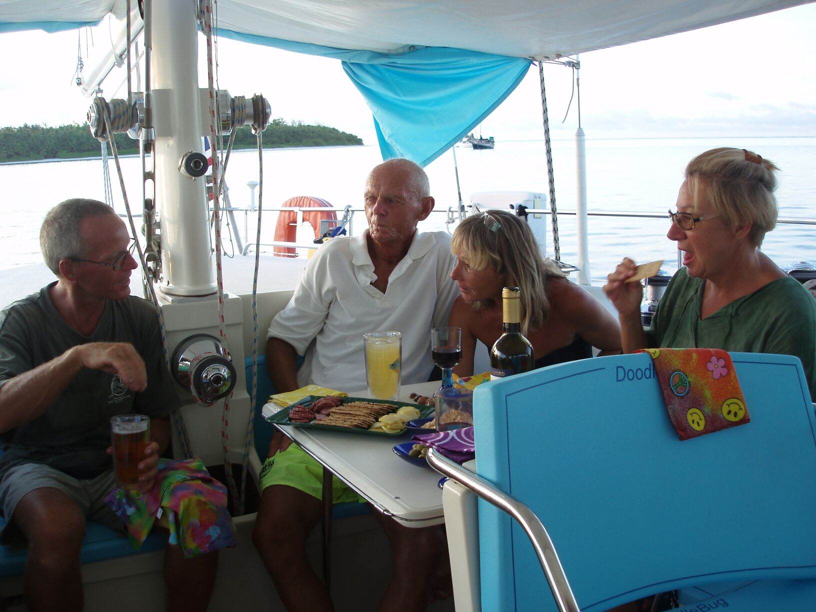 Jen joined us on board DoodleBug for "sun-downers" and we watched a large pod of dolphins gamboling about the lagoon followed by a turtle and then a very large manta ray. The ray swam over the nearby reef, approaching within feet of DoodleBug. Its "wing tips" must have been nearly 12 feet apart. When it swam towards us near the surface of the calm water, we saw a broad "V" bow wave - just like in the "Jaws" movie. Occasionally the tail would appear in the middle of the disturbed water looking a little like a shark's fin but the give-away were the two smaller "fins" that were it's wing tips. Very exciting!