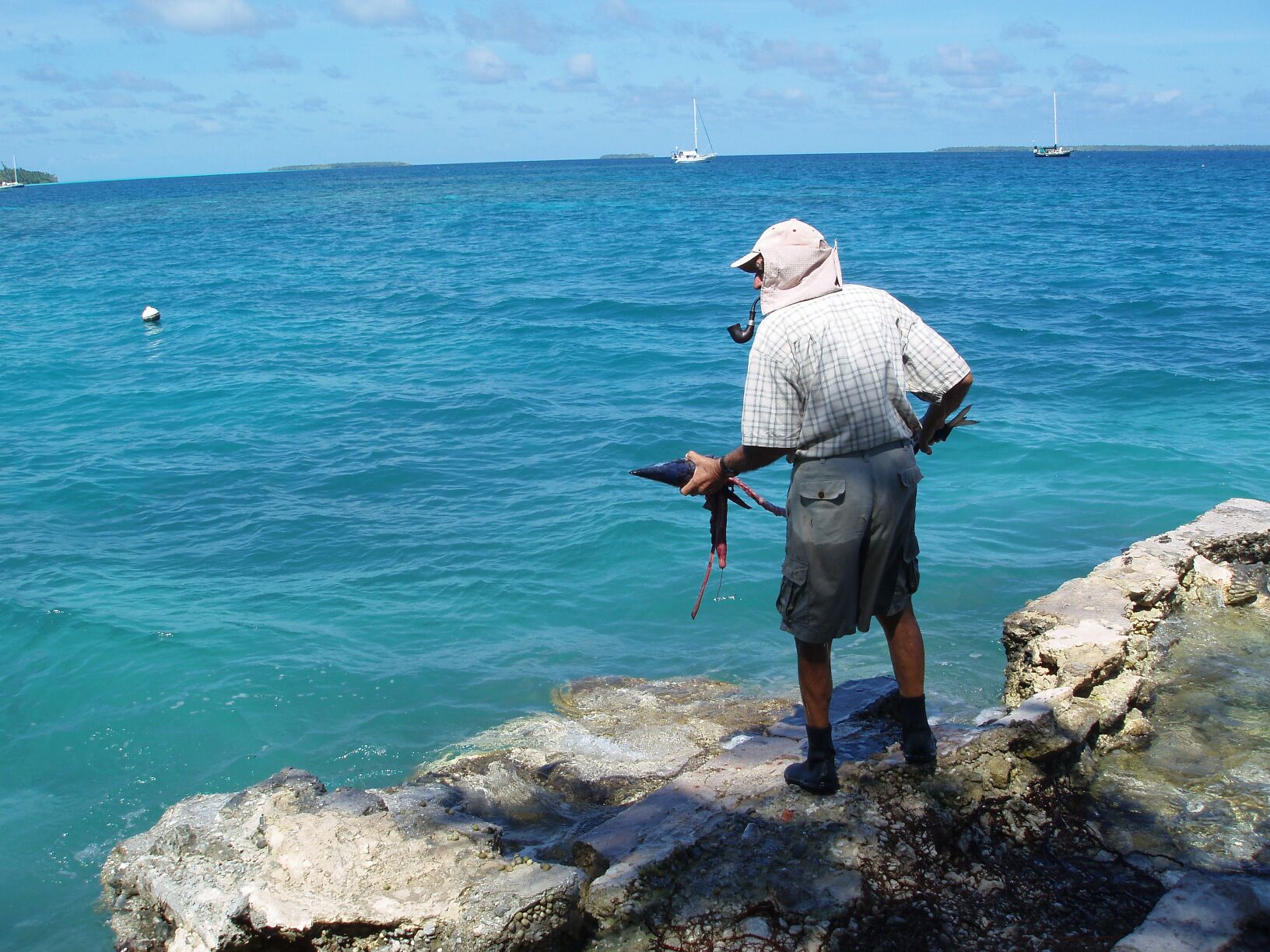 On Friday, the hard drive on my laptop crashed and we are now using the back-up machine and hoping it will last until we reach electronic civilization. We have cleaned the marine growths from the hull on DoodleBug and scoured the propeller clean. The propeller cleaning procedure was closely supervised by one of the fish that has taken up residence below our hull. We have acquired quite a school and they become very excited if we cast food scraps overboard or flush the toilet yummy!). Anyway, I was wearing a scuba tank as I cleaned the prop and my fish "supervisor" was no more than 10 or 12 inches from my hands as I worked.