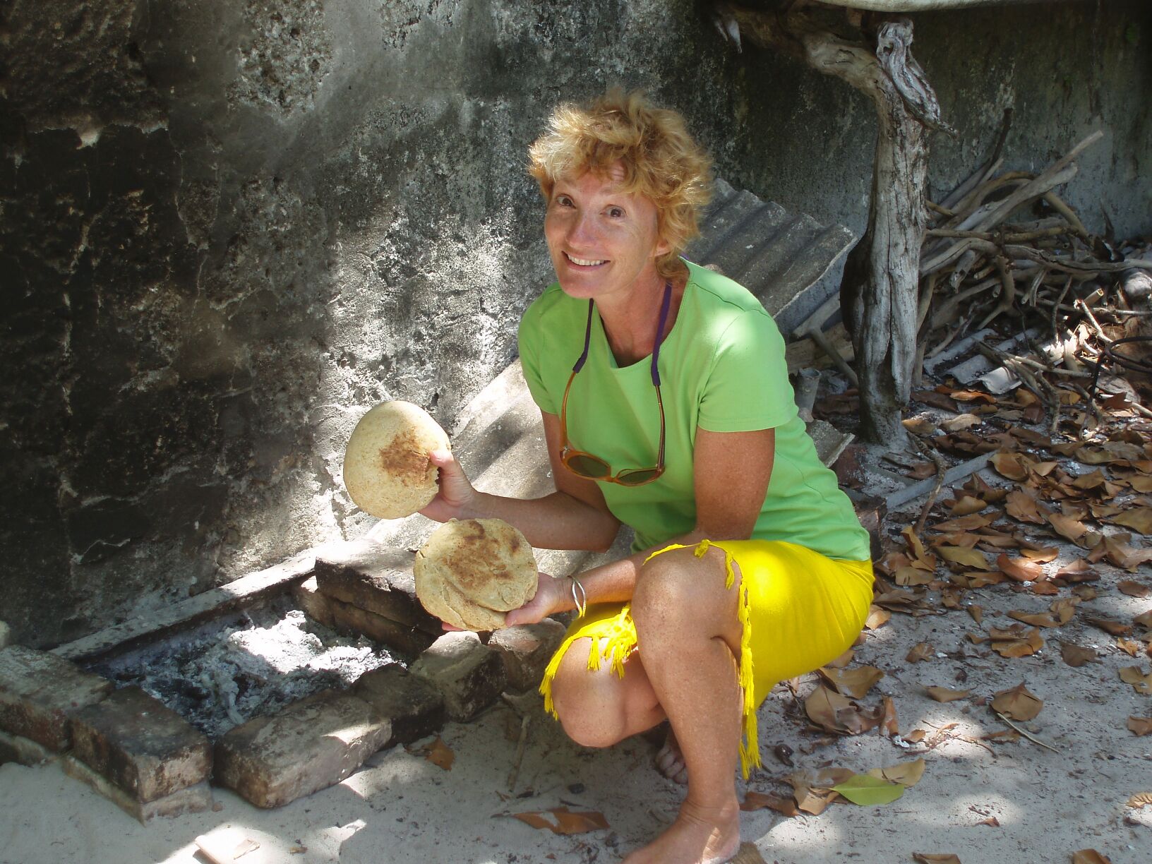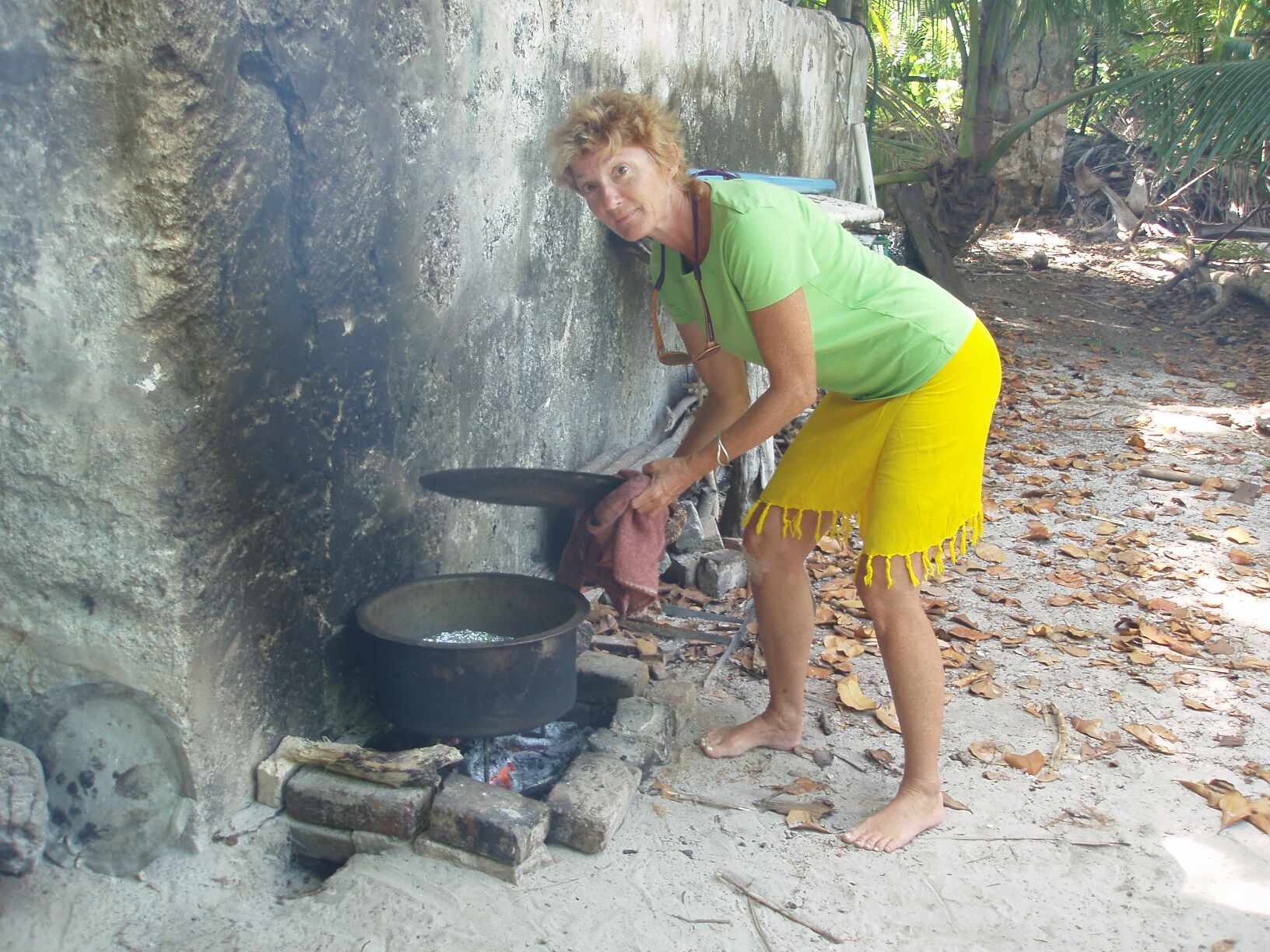 These are ship busting coral pinnacles and required some sharp maneuvers to weave between them, particularly as we approached the anchorage. There were five other yachts anchored off Ile Baddam. Jens on Carita had arrived a few days before we did, there were two French boats visiting from the southwest Indian Ocean, and two long term resident boats. We dinghied over to meet Kevin and Diane on Lady Guinevere and also Richard and Alev on Muggerl. Richard and Diane have spent months here out of every year during the past decade. This is the third visit by Richard on Muggerl. Three years ago he was diagnosed with multiple cancers and has had a portion of his tongue surgically removed. As a recovering cancer patient, he had made a vow to try and spend a year anchored here. Annette went ashore with Diane and Alev to bake bread in a "pit" oven and to wash bottles for brewing beer.