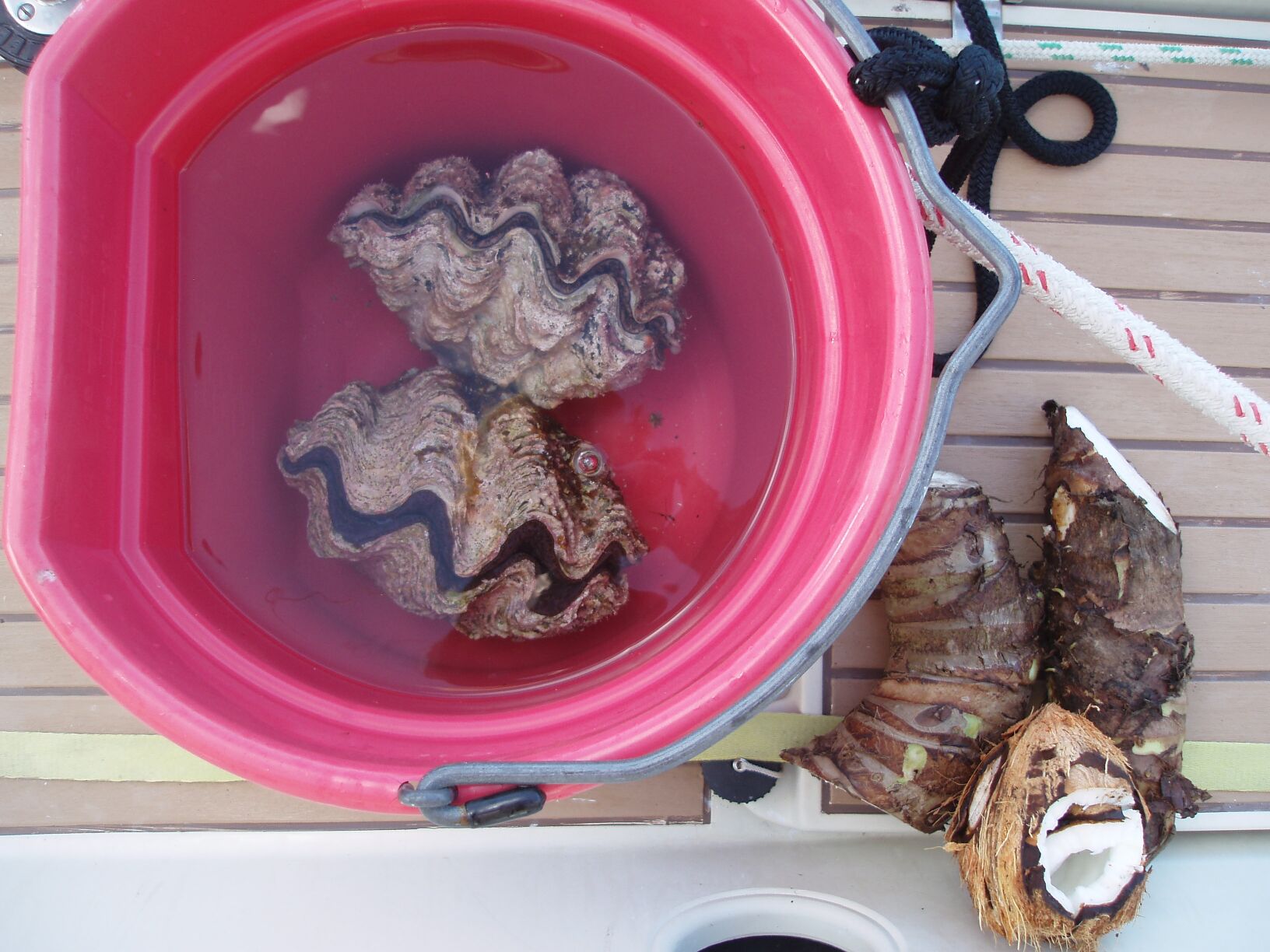 Annette hacked a recently dropped coconut down to it's edible constituents and also found a large patch of wild "taro". She hacked off a large root and we hauled our gatherings back to the dinghy. By this time we were sweaty, covered in bug-spay, itching with mosquito welts and definitely hot. We snorkeled the reef to cool down near Doodlebug and where we had seen the turtle/manta ray. The reef was in excellent condition with fish of all colors and sizes and a cornucopia of corals. Annette found a colony of large clams and decided to add a couple of these to the day's collection. These were deposited in a large bucket of sea-water back aboard DoodleBug and given a scoop of cornmeal to feast upon.