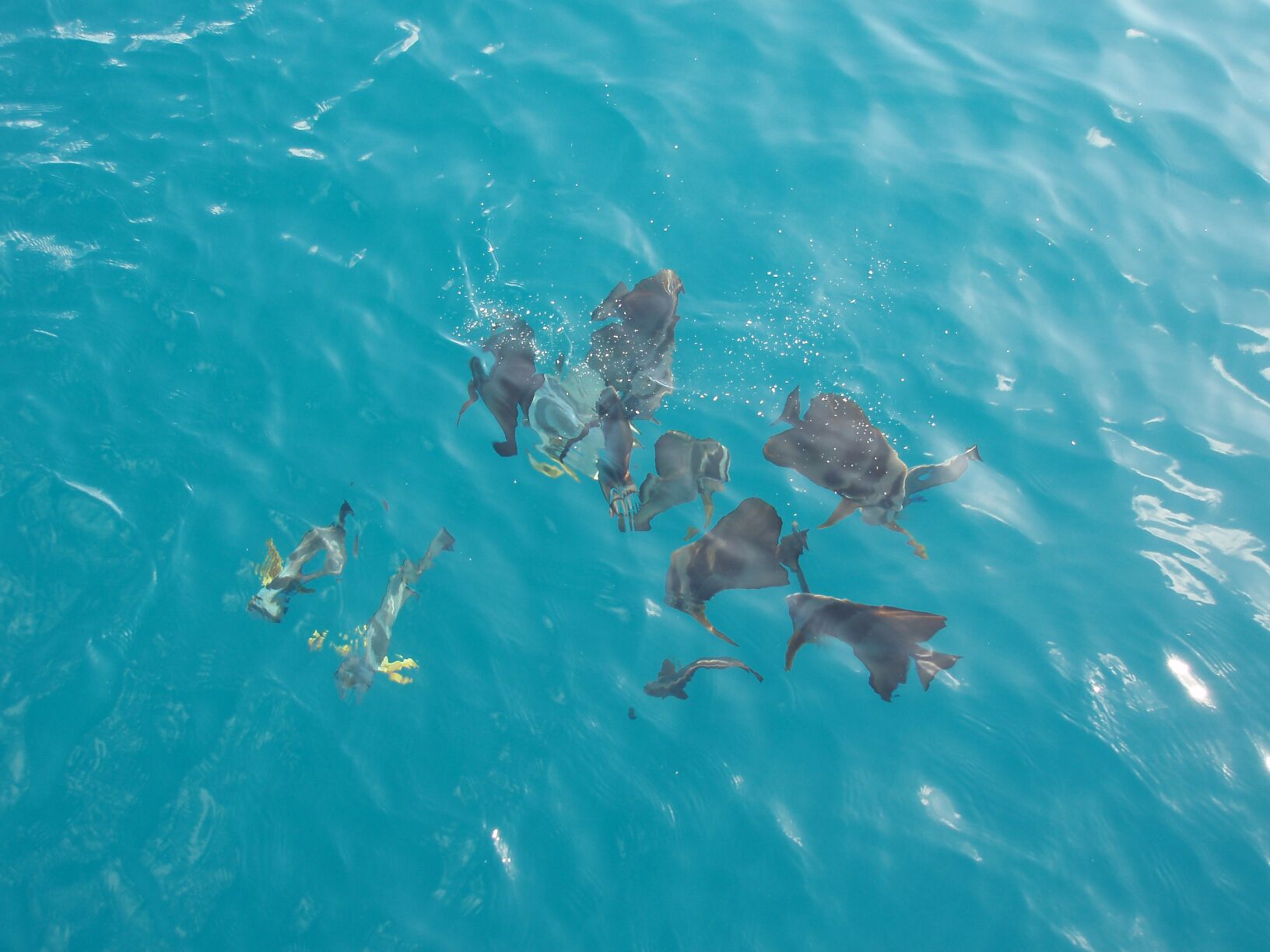 much fun but not quite as frightening to watch. We had acquired our own school of about a dozen reef fish that hang around. We watched their feeding frenzy as we fed them
