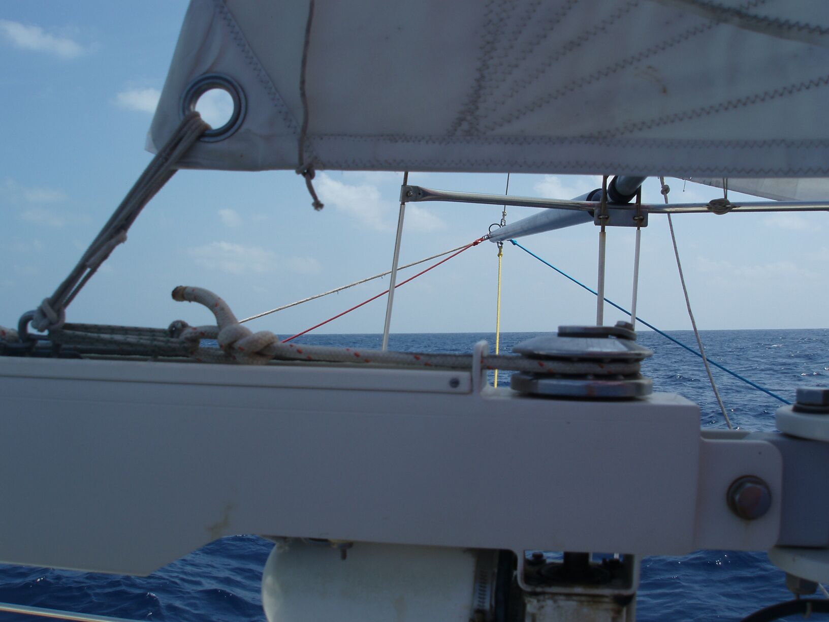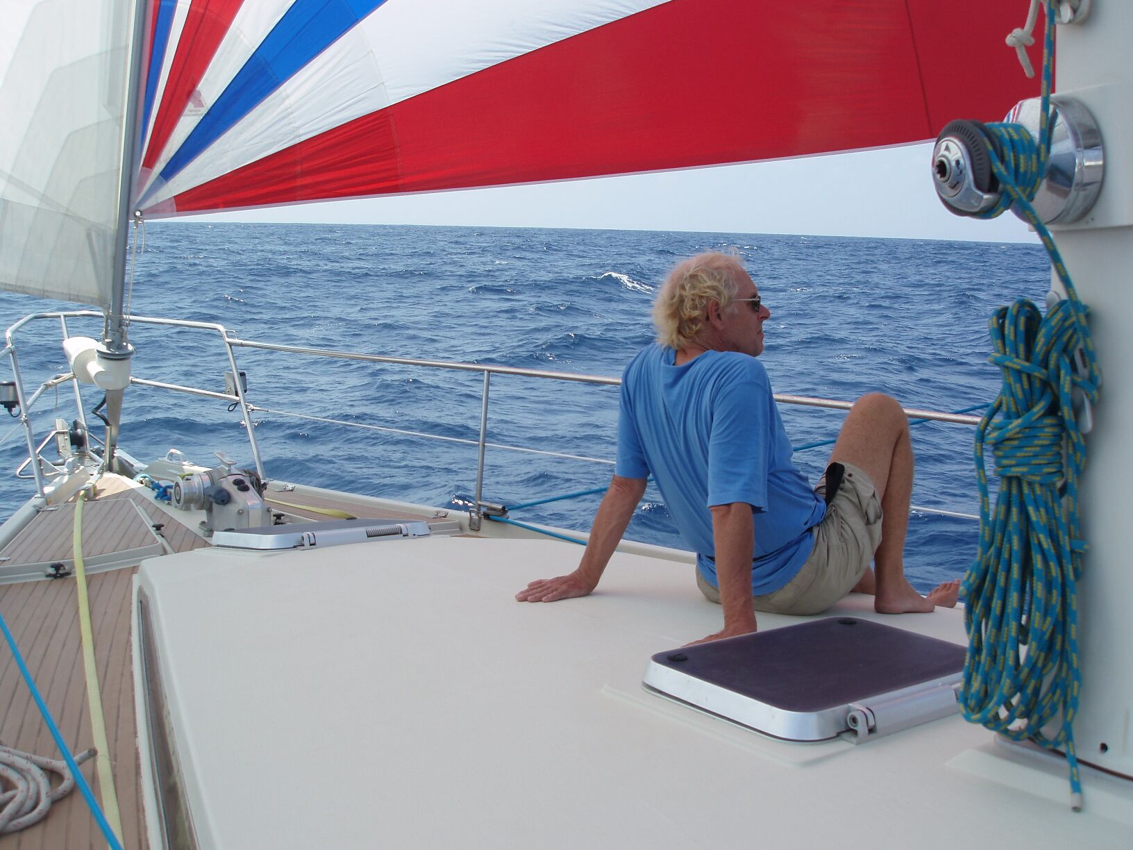 Yesterday we had sailed pretty much downwind all day, with the Genoa poled to starboard and "goose winging" the mainsail. That is, the mainsail was out on the port side, with a preventer to stop it from accidentally "jibing" - or switching to the starboard side in an uncontrolled swing and breaking everything. We were also using the mizzen sail with a preventer. There was an awkward motion to the boat all day and night, as a short and steep roller would pass the stern. This motion causes the two booms to occasionally slam against the preventers and you then feel like the boat is coming apart. The advantage of this rig is that you can get these sails down easily if necessary. The forecast had the possibility of squalls and during the night we had seen the first of these on the radar display. The pods of rain did not contain any strong winds and so this morning, we rigged the "Genoa" to port and the "Ballooner" to starboard. These two sails are both on the head stay and provide nearly 1,500 square feet of sail in a balanced configuration. No more crashing and banging from the preventers! The change was very pleasant, although the same short, sharp, swells have persisted. It looked like the bow was buried at one end of DoodleBug, while the seas were washing over the step at the stern. It looked so strange, I even checked compartments to make sure we were not taking on water and sinking.