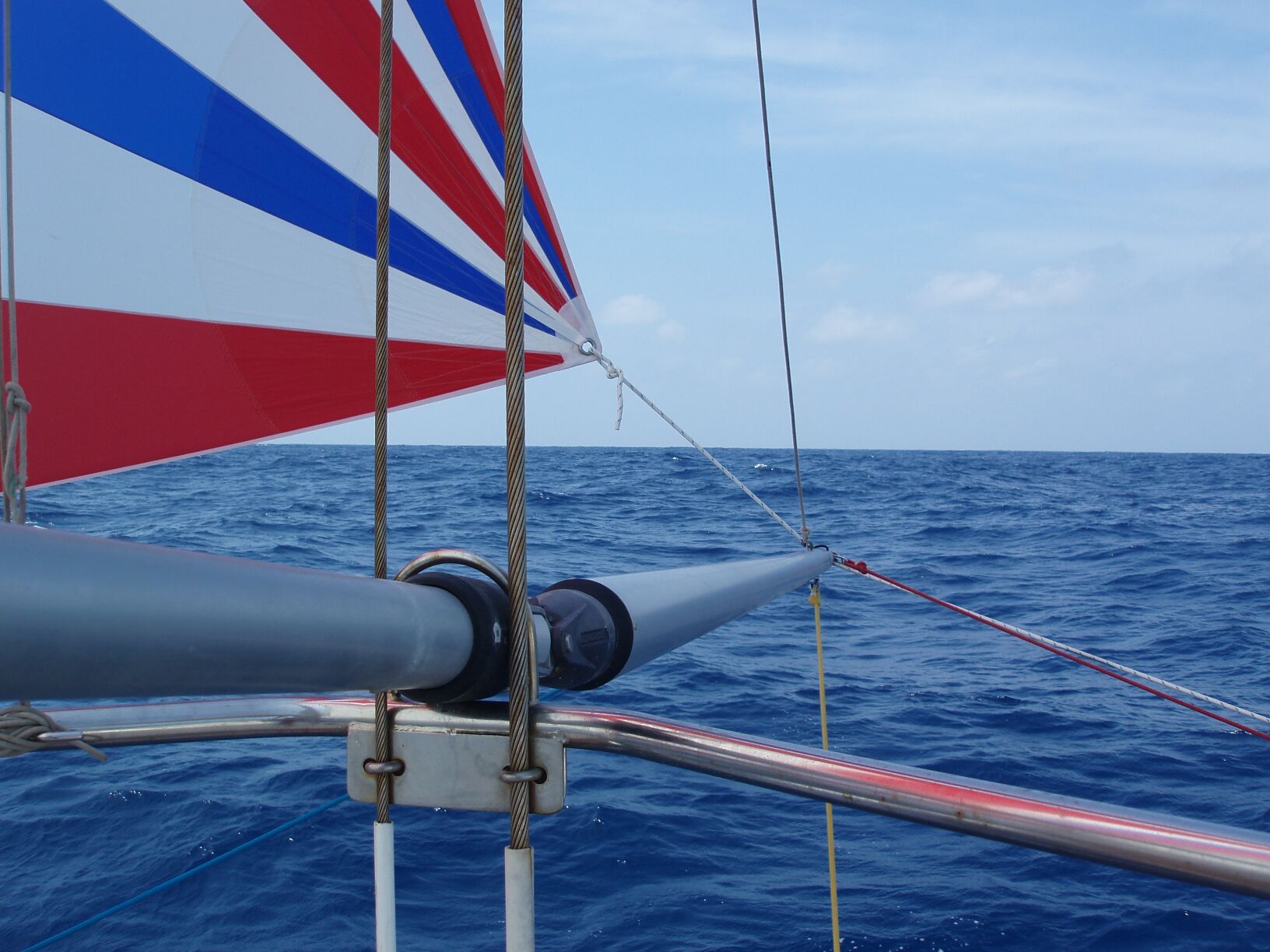 All good things must come to an end and after completing a 24 hour run of 165 miles, a line of rain cells passed us by. There was just a little wind associated with the mini-"front" but the wind shifted 30 degrees from the dead run we have held for 8 straight days. We went to a broad reach with Genoa, main and mizzen but left the ballooner rigged and laid flush across the Genoa. After an hour, there had been no change in wind direction and we struck the ballooner, de-rigged it's pole and packed everything away. Right on cue, the wind switched back to a dead run and our speed dropped. We re-rigged the Ballooner, only this time the head of the Ballooner would not" lock" into it's fitting at the top of the forestay. We lowered it, checked everything, tried again. At the third attempt, the process worked and the Ballooner luff was in place. Unfortunately the sail had now blown behind the Genoa and the sheet (sailor word for rope) was completely under the hull and running to the pole on the opposite side of the boat. Annette is meanwhile buried under a pile of Ballooner and trying to hold it out of the water. I ran a second line to the Ballooner clew and lashed it to the boat, untied the sheet and let it go. It zipped out of my hands, as we were still under full sail and was soon trailing in the water on the starboard side, well out of reach. I swung the pole back in to the vessel, grabbed the soaking line, re-rigged the pole, reattached the sheet to the Ballooner and rescued Annette, who was completely hidden but grimly hanging on. What a fun way to pass a morning!