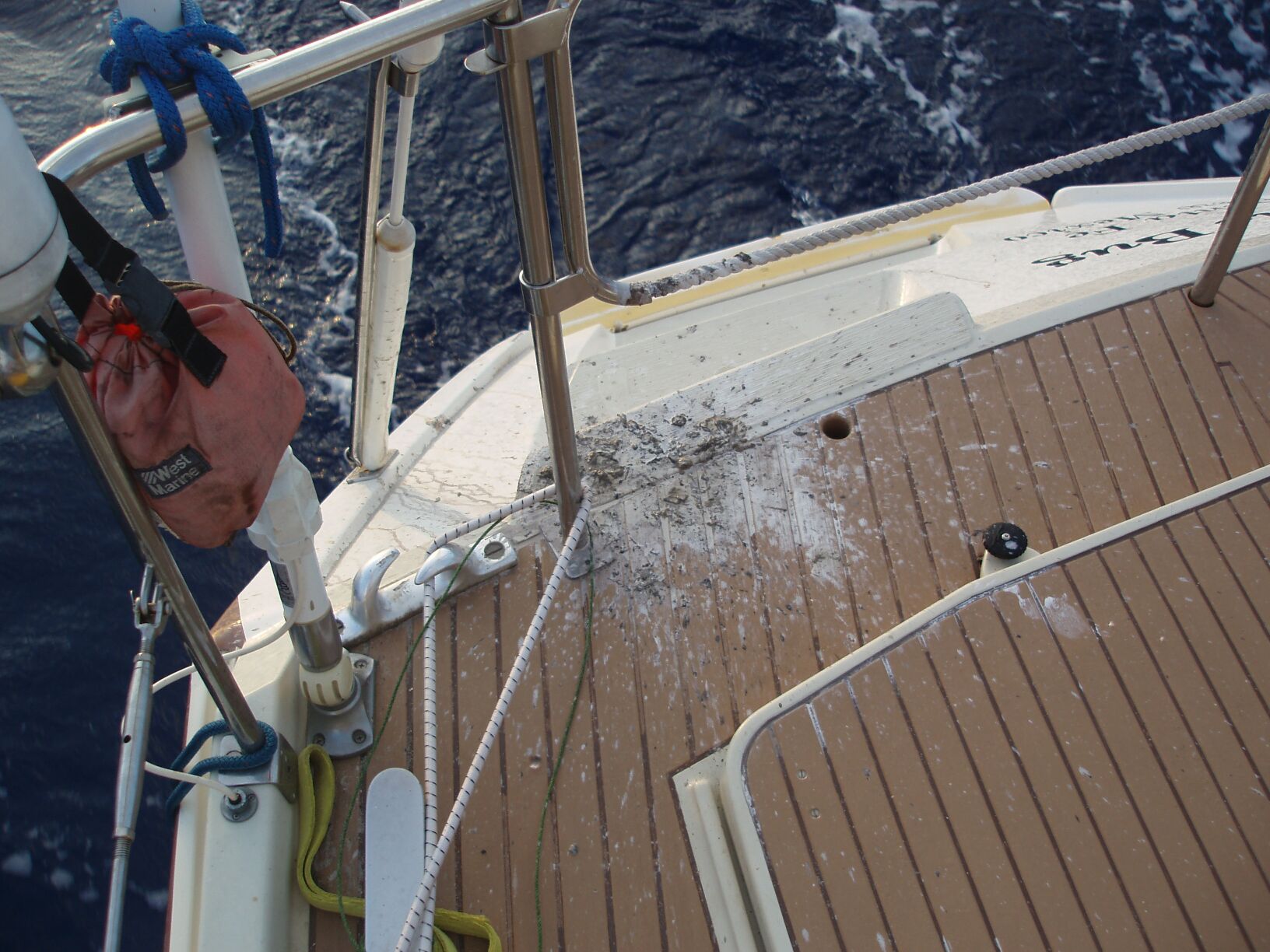 amount of it's body weight. Everything within a radius of 20 feet of the mizzen mast received it's due. The mizzen sail, port sheet winch and port deck received a liberal coating. All night long